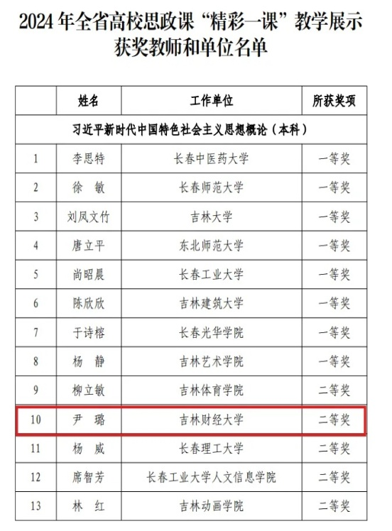 近日,吉林省教育厅发布2024年全省高校思政课“精彩一课”教学展示获奖教师和单位名单,乐天使魏泰龙老师在本次教学展示活动中获得《思想道德与法治》课程一等奖,刘方老师获得《中国近现代史纲要》课程二等奖,尹璐老师获得《习近平新时代中国特色社会主义思想概论》课程二等奖,孔相宜老师获得《形势与政策》课程三等奖。
