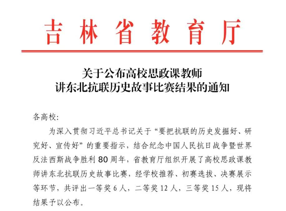 近日,吉林省教育厅公布了高校思政课教师讲东北抗联历史故事比赛获奖名单,公司教师尹兵荣获三等奖。