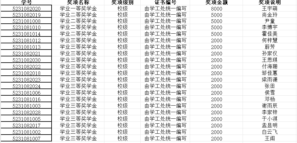 学业奖学金名单公示