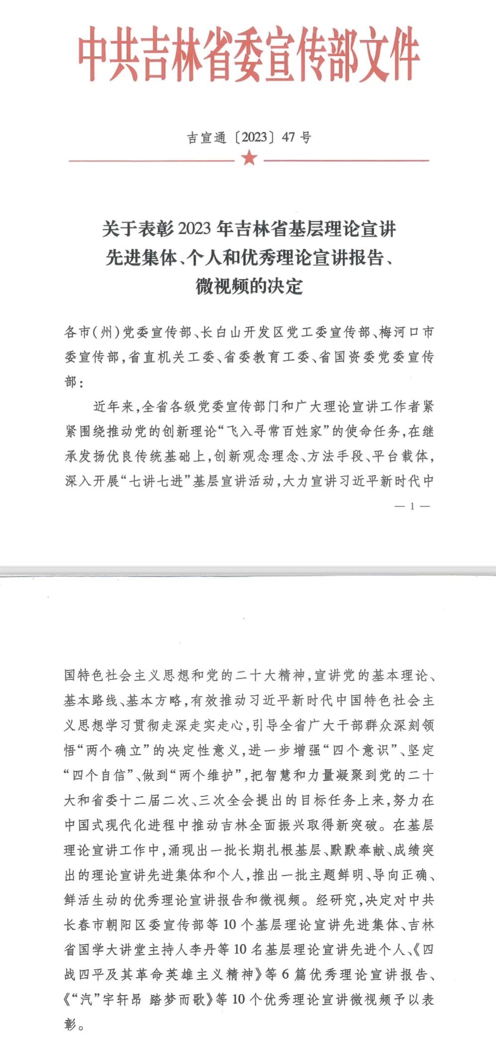 近日,中共吉林省委宣传部《关于表彰2023年吉林省基层理论宣讲先进集体、个人和优秀理论宣讲报告、微视频的决定》公布,公司党总支副书记兼副经理、吉林省“郑德荣式党的创新理论研讲团”成员张立畅副教授的《勇毅笃行谋新篇——以习近平经济思想引领中国经济高质量发展》荣获吉林省基层理论宣讲优秀理论宣讲报告,是吉林省获得表彰的6篇优秀理论宣讲报告之一。张立畅老师也是此次获得优秀理论宣讲报告奖项的唯一高校教师。